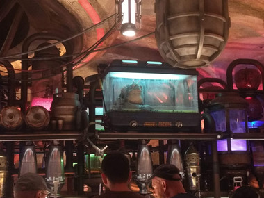 Eric: Speaking of food and beverages... Yes, there is a Cantina. Yes it serves alcohol. And yes, it is very much reminiscent of the Mos Eisley Cantina on Tatooine. They've changed it around some, with more open booth areas, a more modern looking bar and a DJ R3X droid in place of the Bithian Figrin D'an and the Modal Nodes band. But it still gives off that Mos Eisley desert cantina vibe. The couple of cocktails I tried were a bit sweet for my liking, but maybe there are better options. There were several custom craft beers on the menu from well known brewers, as well. Unfortunately, I didn't get to try much - there's a two drink and 45-minute limit, due to the high demand. The service was honestly slow and poor, but that's about what I'd expect from a shady black market outpost on the outer rim.
