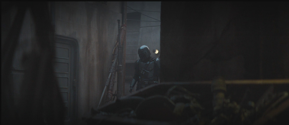 In yet another nod to Boba Fett fans, we catch a glimpse of a Mandalorian that shares many features with the iconic bounty hunter introduced in Empire Strikes Back - including the unmistakable helmet design (complete with a dent in the upper right side). We've caught brief glimpses of this Mandalorian in previous scenes, but never anything this close up. To be certain we're clear, there's no reason to believe this is Boba Fett. It's not a perfect match. But it does seem like the character is intended to invoke his likeness.